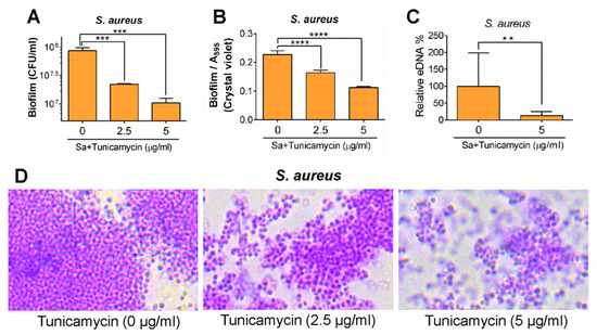 Tunicamycin-mediated inhibition of teichoic acids also suppresses S. aureus biofilm formation in a dose-dependent manner. Upper panels (A–C) show a quantitative assessment of biofilm formation (colony counts, crystal violet staining, and eDNA amounts), and lower panel (D) shows crystal violet-stained S. aureus cells in biofilms in the presence of variable concentrations of tunicamycin. The figure was adapted with permission from Zhu et al. 2018 [77]. ****, p < 0.0001; ***, p < 0.001; **, p < 0.01.