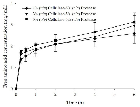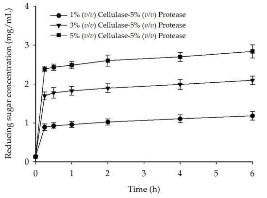 | 5% (v/v) cellulase and 5% (v/v) protease | 63.7 ± 1.2 c | 94.7 ± 0.8 a |