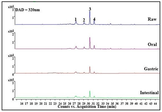 3.1. Change in Phenolic Profiles of THR Extract during In Vitro Digestion