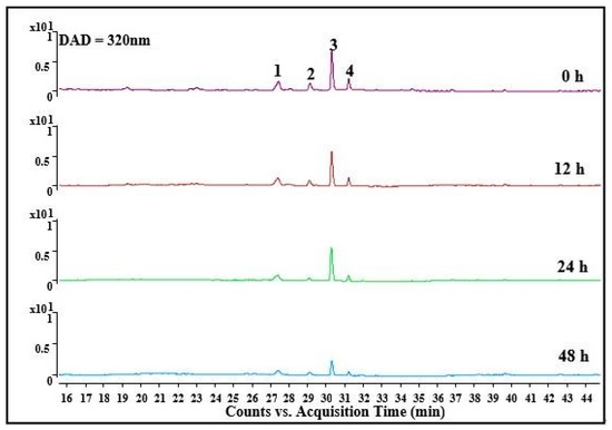 3.2. Change in Phenolic Profiles of THR Extract during In Vitro Colonic Fermentation