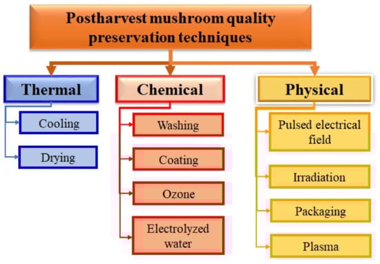 Recently, Zhang et al. [57] reviewed postharvest preservation techniques used to maintain the quality and extend the shelf life of mushrooms. These authors classified these preservation techniques into three categories: thermal, physical, and chemical [57]. Figure 1 shows a summary of the strategies that have been studied to slow or halt chemical deterioration and microbial growth and avoid recontamination of the mushroom.