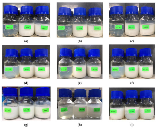 The changes in physical appearance of SBH NEs. From left to right, the samples are denoted as A1, A2, and A3, kept for 0 days’ storage at room temperature (a), 4 °C (b) and 40 °C (c); 7 days’ storage at room temperature (d), 4 °C (e), and 40 °C (f); and 14 days’ storage at room temperature (g), 4 °C (h), and 40 °C (i).