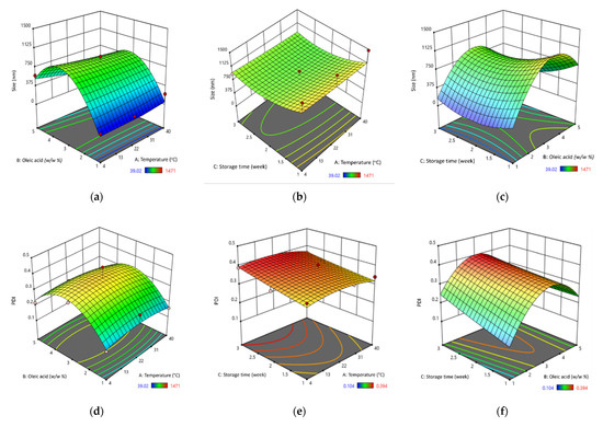 Response surface plot of the particle size of SBH NEs in response to the combined effect of temperature and oleic acid (a), temperature and storage time (b), and storage time and oleic acid (c); Response surface plot of the PDI of SBH NEs due to the combined effect of temperature and oleic acid (d), temperature and storage time (e), and storage time and oleic acid (f). A red dot represents points above the predicted value and a pink dot represents points below the predicted value.