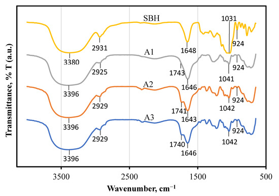 Figure 3 shows the variation of FTIR spectra 4000 to 650 cm−1 in formulations A1, A2, A3, and a control sample, SBH. The graphs clearly show spectral differences between functional groups. Dominant peaks shown in all FTIR (around 3396 cm−1 and 1648 cm−1) were attributed to OH stretching and OH deformation; the band around 2929 cm−1 was attributed to the C-H stretching in the carboxylic acids and NH3 stretching in the honey [38]. The band around 1648 cm−1 indicates the stretching of C=O in the carboxylic functional group, whereas the band at 1051 cm−1 and 1259 cm−1 corresponds to the stretching vibration of C–OH and C–O in the honey [39]. Next, the peak which appeared at 924 cm−1 was attributed to the stretching modes of carbohydrates in the honey, such as C-O and C-C [40]. However, observation of the formulations A1, A2, and A3 indicated a peak around band 1740 cm−1, which was attributed to the stretching vibration of C=O in the oleic acid [41]. Overall, the functional group of formulations A1, A2, A3 and the control sample, SBH, after being subjected to HPH for 5 cycles at 100 MPa at room temperature, was still the same as the functional group of the honey. Besides, it has been reported by Mail et al. [42] that the functional groups of SBH are almost identical to those of common honey produced by Apis bees. The authors also stated that SBH has lower absorption in carbohydrate regions and high absorption in water regions due to its natural chemical constituents.