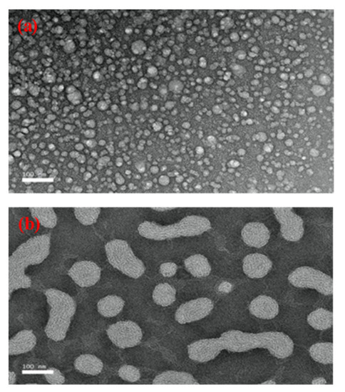 TEM images were used to confirm the particle size of formulation A1 and to compare its morphology with the control sample, SBH. As shown in Figure 4a, the particle size of SBH was less than 100 nm. As shown in Figure 4b, the particle size of formulation A1 with 1% (w/w) oleic acid was also less than 100 nm, but larger than the control sample. Though formulation A1 matched the result obtained by the particle size analyser, the differences from the particle size of SBH were large. The difference in particle size between A1 and SBH may be due to the presence of oleic acid. Furthermore, the results for the SBH sample showed a spherical-shaped particle, similar that observed by Prakash et al. [43] and Lu et al. [44], who studied linalool NEs and citral NEs, respectively. These authors reported that the observed NEs were spherical in shape and their size matched the results from the particle-size analyser. However, for A1, some of the droplets shown were an irregular shape. This may be due to the presence of oleic acid, which has a different viscosity than SBH. Abdou et al. [45] also found a similar result for droplets in curcumin-sunflower oil NEs, which were not spherical in shape due to the difference in viscosity of the materials used. As shown in Figure 4b, the droplets of formulation A1 were not evenly distributed due to the presence of some irregular-shaped droplets. This contradicts the findings of Saari et al. [46], who found an even distribution and spherical-shaped droplets in their study of curcumin-loaded coconut oil and honey NEs.