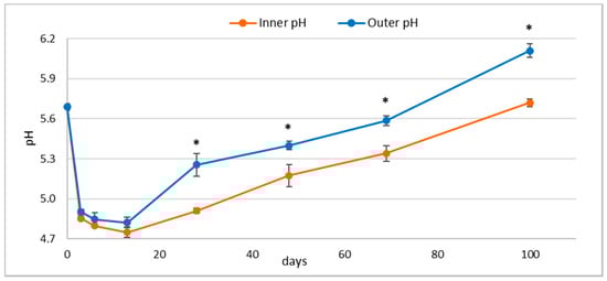 Evolution of pH during the 100 days ripening period in the inner and in the outer section of Ventricina samples. Standard error bars are showed. Sampling times with an asterisk were characterized by significant differences between samples according to Mann-Whitney test.