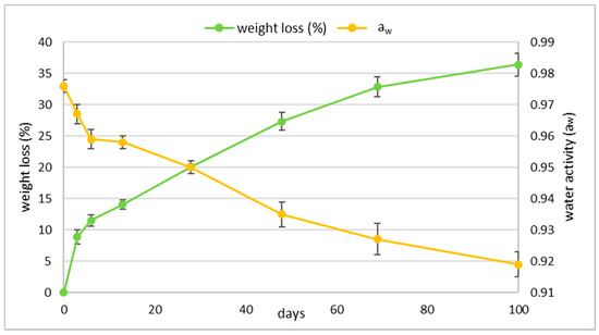Evolution of weight loss and water activity (aw) during the 100 days ripening period of Ventricina samples. Standard error bars are showed.