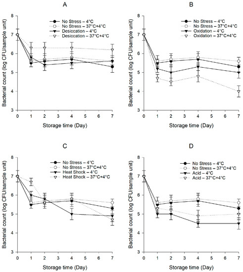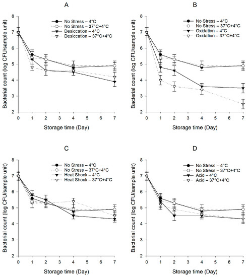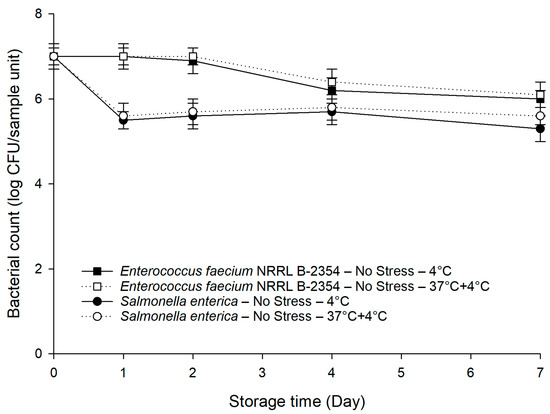 Both S. enterica and E. faecium NRRL B-2354 were exposed to sub-lethal desiccation, oxidation, heat shock, or acid stress as follows: (1) Desiccation stress: One milliliter of 1 M NaCl (aw 0.96) containing 9.0 log CFU/mL of bacterial cells was incubated at 22 °C for 2 h [22], (2) Oxidation stress: A mixture of 1 mL of TSB containing 9.0 log CFU/mL of bacterial cells and 1 mL of 300 mg/L sodium hypochlorite (final concentration of sodium hypochlorite: 150 mg/L), as measured by free chlorine test strips (Hach Company, Loveland, CO, USA), was incubated at 22 °C for 2 h [23], (3) Heat shock: One milliliter of TSB containing 9.0 log CFU/mL of bacterial cells was incubated at 48 °C for 1 h [24], and (4) Acid stress: One milliliter of TSB of pH 5.0 by the addition of 1 M hydrochloric acid containing 9.0 log CFU/mL of bacterial cells was incubated at 30 °C for 1.5 h [25]. Fresh cells in sterile 0.85% saline prepared using overnight cultures served as the unstressed control.