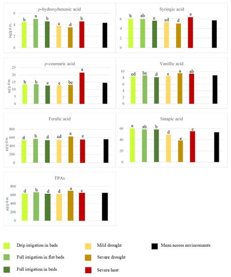 Moreover, the results showed that sinapic acid was not enhanced neither by water scarcity nor by elevated temperatures, but it increased under the drip irrigation in beds, full irrigation in flat beds, and full irrigation in beds conditions (p < 0.05). The outcome results also remarked a rise of the two major phenolic acids (i.e., ferulic and sinapic acids), and of the least abundant p-hydroxybenzoic acid under the full irrigation in flat beds condition.