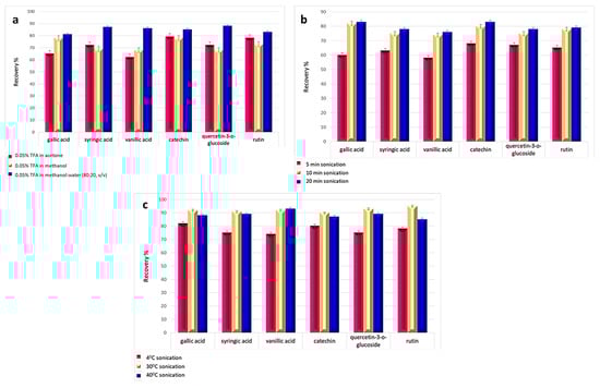 The extraction solvent was the first factor to be studied. According to the results presented in Figure 1a, the higher recoveries were obtained for 0.05% TFA in methanol:water at 60:40 ratio, v/v). The findings are in accordance with the literature, since the majority of the studies report the use of acidified mixtures of methanol:water []. The second factor that was evaluated was the time of the extraction in an ultrasonic bath. According to the results presented in Figure 1b, the increase in the extraction time increased the recoveries of all the analytes. The difference in the extraction efficiency between 10 min of sonication and 20 min was less than 4% and, in an attempt to minimize extraction time, the extraction time of 10 min was selected as the optimum for the next experiment. The last parameter that was evaluated was the extraction temperature. Three different temperatures were tested (4 °C, 30 °C and 40 °C). The highest recoveries (≥90%) were obtained at 30 °C, and this temperature was selected as the optimum. The extraction at low temperature (4 °C) was not sufficient enough resulting in low recoveries over the range 72–81%. On the other hand, the further increase of temperature at 40 °C resulted in a slight decrease of the obtained recoveries, compared to the results obtained at 30 °C, which could be explained due to the degradation of phenolic constituents at higher temperatures [].