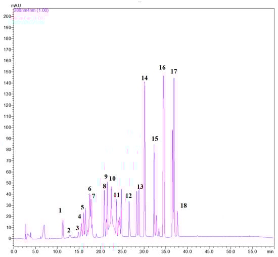 The optimized and validated HPLC-DAD analytical method was applied in the analysis of real samples. Twenty-six walnut samples belonging to the Chandler variety originating from Bulgaria, Greece, and France were analyzed and eighteen phenolic compounds were determined, in total. Those were: caffeic acid, ferulic acid, gallic acid, p-coumaric acid, rosmarinic acid, sinapic acid, syringic acid, and vanillic acid, from the class of phenolic acids, and catechin, diosmin, epigallocatechin gallate, gallocatechin gallate, kaempferol, myricetin, myricitrin, quercetin-3-o-glucoside, rutin, and vanillin from the class of flavonoids. Table 4 lists the identified phenolic compounds along with their retention times Rts and maximum absorption wavelengths (λ, nm). Figure 2 presents a characteristic chromatogram of a walnut sample spiked with a standard mixture at 2 μg/g and monitored at 280 nm.