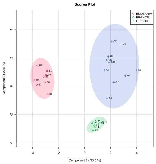 The further analysis of the chromatographic results with chemometric tools enhances the conclusions derived from the experimental data. The development of chemometric models enables the establishment of mathematical correlations in the data matrix, allowing the discovery of trends and behaviors among the samples. To such an end, the development of pattern recognition models allows the presentation of significant and non-evident information that is critical in authenticity issues []. Several authenticity studies have used unsupervised chemometric tools such as Principal Component Analysis (PCA) for exploratory data analysis, displaying the similarity of the observations as points in a map (score plot) [,,]. Even though PCA finds correlations among the features successfully, it is affected by scale, and it may cause loss of information as compared to the original list of features. Supervised recognition techniques such as partial least squares–discriminant analysis (PLS-DA) overcomes the weaknesses of unsupervised methods and is considered unique in exploratory data analysis, providing good insight into the causes of discrimination via loadings and weights [,].