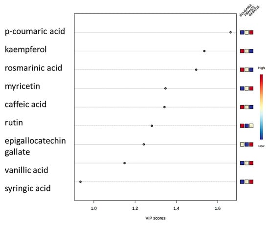 A PLS-DA model was developed using the MetaboAnalyst platform []. The chemometric model classified the samples according to the geographical origin (Bulgaria, Greece, and France) successfully with an explained variance of 59.5% within the first two dimensions. The score plot of the developed PLS-DA model is presented in Figure 3, showing the clustering of three individual groups of walnut samples. The colored areas around the samples (red for Bulgaria, blue for Greece, green for France) represent the 95% confidence region of the replicates. Variable importance in projection (VIP) algorithm was used to estimate the significance of each variable in projection used to build the PLS-DA model. The VIP scores of the variables show their contribution in the final model. According to Mehmood et al. [], the cut-off value of above 0.83 was used for the VIP score. The Figure 4 shows the most important features with calculated VIP scores above 0.83. p-Coumaric acid, kaempferol, rosmarinic acid, myricetin, caffeic acid, rutin, epigallocatechin gallate, vanillic acid, and syringic acid were selected as the most important markers responsible for the discrimination between the walnut samples originating from different countries. According to Figure 4, the compounds that cause greater variation and are characteristic for each geographical origin are marked in red. In this respect, p-coumaric acid, myricetin, epigallocatechin gallate, syringic acid and vanillic acid cause greater variation in the Greek samples; while kaempferol, rosmarinic acid, caffeic acid and rutin are characteristic markers of the Bulgarian walnuts. The compounds marked in yellow cause slightly lower variation to each category of samples, and those marked in blue cause the lowest variation.