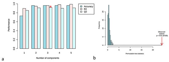 (a) Cross validation parameters of the developed PLS-PDA model with the prediction error measure: accuracy, R2, Q2 (The accuracy = 0.96, was obtained from the third component shown with asterisk.); (b) Permutation test statistics (100 random permutations).