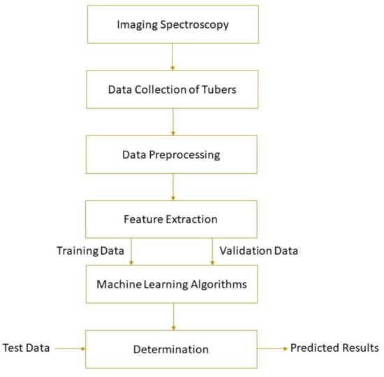 The spectral parameters of the detected object and its physical or chemical properties can be correlated by machine learning. Machine learning uses mathematical algorithms to explore the rules that exist in big data to assist decision-making, involving unsupervised learning and supervised learning. More information about machine learning can be found elsewhere [57]. Based on the establishment of the calibration model, the parameter values of unknown samples can be predicted. Machine learning methods, such as principal component regression (PCR), hierarchical cluster analysis (HCA), support vector machine (SVM), partial least squares regression (PLSR), multiple linear regression (MLR), locally weighted partial least squares regression (LWPLSR), artificial neural network (ANN), and least square support vector machine (LS-SVM), have been widely used in food analysis [58,59,60,61,62]. Feature variable selection based on genetic algorithm (GA) [63], competitive adaptive reweighted sampling (CARS) [64,65], first-derivative and mean centering iteration algorithm (FMCIA) [66], regression coefficient (RC), successive projection algorithm (SPA) [67], and principal components analysis (PCA) [58] help to eliminate the feature overlap of continuous spectral information, which is conducive to the development of more robust and simplified machine learning models [68]. A high-performance model requires higher determination coefficients for cross-validation (R2CV) and prediction (R2P), correlation coefficients for prediction (RP), and lower root mean square errors for cross-validation (RMSECV) and prediction (RMSEP). Figure 1 shows the schematic of a general framework for tuber quality determination based on imaging spectroscopy. Detailed applications of the technology are given in the following section.
