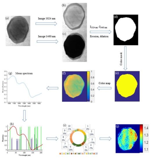 Visualization process of potato SG based on hyperspectral imaging. (a) The corrected hyperspectral image, (b) band image at 1024 nm, (c) band image at 1460 nm, (d) mask image, (e) color mask, (f) spectral reflectance index, (g) average spectrum, (h) feature variable selection, (i) feature variable reduction, and (j) distribution map of SG [93].