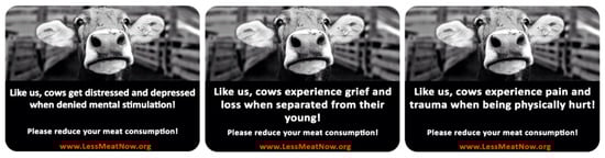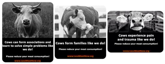 Successful previous meat reduction interventions intended to curb meat consumption employed a variety of methods that ranged from a focus on animal welfare, human health, environmental concerns or a mix to motivate respondents to change their behavior []. The majority of these interventions solely used text with no images being involved [,,,,,]. Of those studies in which animal welfare was utilized as a meat reducing method, the fashion in which it was communicated was in a sterile and non-anthropomorphic way (i.e., “…Maltreatment, such as the castration of male piglets without anesthesia … is also still common” []). Considering the above, we set out to test whether anthropomorphizing animals stressing the animal’s cognitive ability (“intelligence message”), the animal’s pro-social behavior (“pro-social message”) or the animal’s ability to suffer (“pain message”) reduces meat consumption intentions.