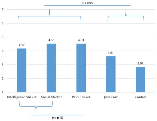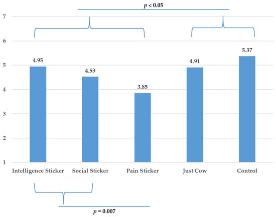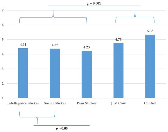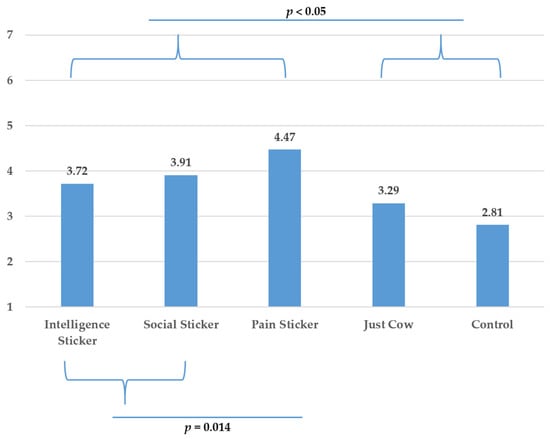 A one-way analysis of variance (ANOVA) taking package (control, just cow, and the three anthropomorphic stickers) as independent variable and purchase intention as dependent variable showed a significant effect (F (4270) = 6.317, p < 0.05, η2 = 0.086). Similar results were also observed for intentions to reduce meat consumption F (4270) = 8.575, p < 0.05, η2 = 0.113.