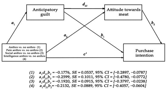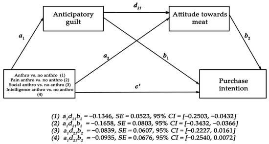 For H3, we conducted a mediation analysis using the PROCESS model 6 macro for SPSS [] to test whether respondents anticipatory guilt and attitudes towards meat mediated the effect of anthropomorphism on their purchase intentions. We dummy coded the conditions as follows: 0 = control and just cow conditions, 1 = all 3 anthropomorphic traits, we entered anticipatory guilt as first mediator and attitude towards meat as second mediator. A bias-corrected bootstrap analysis with 5000 samples and 95% bias-corrected intervals (CIs), indicated a significant indirect effect of anthropomorphism on purchase intentions via anticipatory guilt and attitudes towards meat (β = −0.135, SE = 0.05, 95% CI [−0.250, −0.043], we also observed a significant direct effect of anthropomorphism vs. no anthropomorphism on purchase intentions (β = −0.365, SE = 0.16, 95% CI [−0.686, −0.044]. We can conclude that the impact of anthropomorphism on purchase intentions of meat was partially mediated by anticipatory guilt and attitudes towards meat. As such, the data provide support for H3. A similar mediation analysis on individual anthropomorphic traits vs. no anthropomorphism revealed a significant indirect effect of pain anthropomorphism on purchase intentions via anticipatory guilt and attitudes towards meat (β = −0.166, SE = 0.08, 95% CI [−0.343, −0.036]). However, no such serial mediation was observed for intelligence anthropomorphism (β = −0.093, SE = 0.07, 95% CI [−0.254, 0.072]) or pro-social anthropomorphism (β = −0.840, SE = 0.06, 95% CI [−0.223, 0.016]) because both traits lacked a significant a1 path (conditions’ impact on anticipatory guilt) in their serial mediation (see Figure 6). This is also corroborated by planned contrast tests comparing individual anthropomorphic traits (vs. non-anthropomorphic conditions) on anticipatory guilt which revealed a significant difference between the pain trait condition and the non-anthropomorphic conditions (t (270) = 3.788, p = 0.002), while the difference between the intelligence trait and the non-anthropomorphic conditions was only marginally significant (t (270) = 1.748, p = 0.082) and the difference between the pro-social trait condition and the non-anthropomorphic conditions was non-significant (t (270) = 1.572, p = 0.117).