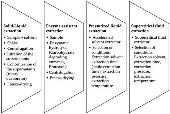 48] and the total phenol contents by the Folin–Ciocalteu method using catechol as the standard. For the enzyme-assisted extraction, different enzymes were checked, that is, carbohydrate-degrading enzymes including Viscozyme L and Cellulase and the proteases, alcalase, and flavourzyme. Additionally to the enzyme-assisted and ultrasound-assisted extraction, hot water extraction was carried out. The authors observed differences among the extraction procedures, the enzyme-assisted extraction seems to be the most effective method; the highest extraction yields were obtained when using both enzymes, carbohydrases, and proteases. On the other hand, with ultrasound-assisted extraction, the extraction was not higher than that obtained with hot water, except for
