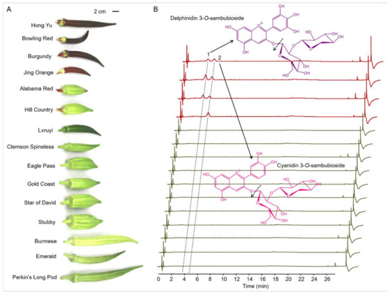 Anthocyanins identified in the pods from 15 okra cultivars using UHPLC-Q-Orbitrap HRMS (Ultra-High Performance Liquid Chromatography coupled with quadrupole Orbitrap high-resolution mass spectrometry). (A) Okra pods display multifarious colors and shapes in various cultivars. (B) UHPLC profiles of the anthocyanins extracted from the tender pods of the 15 okra cultivars. Major cleavage sites of delphinidin 3-O-sambubioside and cyanidin 3-O-sambubioside conformed by mass spectrometry were indicated by dashed arrow.