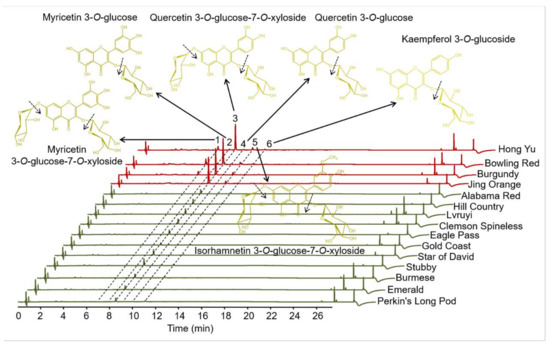 UHPLC-Q-Orbitrap HRMS analysis of flavonol glycosides in okra pods of various cultivars. Major cleavage sites of the flavonol glycosides confirmed by mass spectrometry are indicated by dashed arrows, respectively.