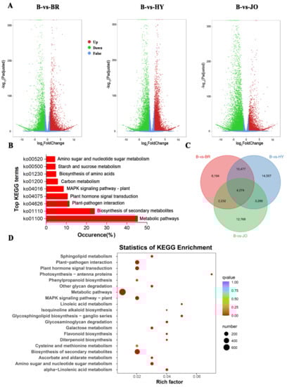 Differentially expressed unigenes between pod skins of the green and purple okra (B vs. BR, B vs. HY, and B vs. JO). (A) Volcano plots displaying the up−regulated, down−regulated, and no−regulated genes of the three compared groups. (B) Top KEGG terms contributed by all the differentially expressed unigenes. (C) Venn diagram showing the shared and the unique differentially expressed unigenes across the three compared groups of okra pods. (D) The top 20 of KEGG enrichment of the 4,274 differentially expressed unigenes shared by the three compared groups.