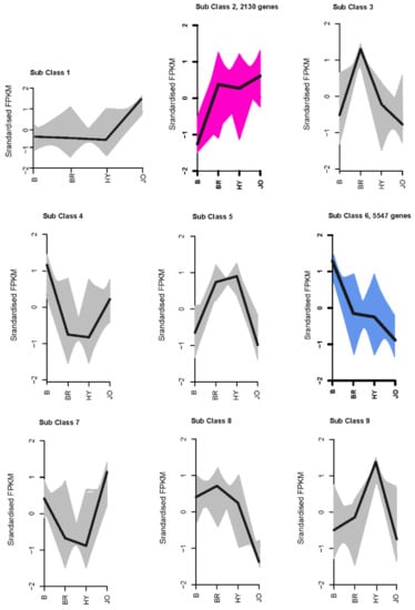 The differentially expressed genes between the green and purple okra pod peels were selected according to the criterion of the log2|Fold Change| > 1 and FDR < 0.01. We identified 23,177, 32,596, and 22,562 differentially expressed unigenes for B vs. BR, B vs. HY and B vs. JO, respectively (Figure 3 and Table S4). Among differentially expressed unigenes, 12,307, 18,051 and 7381 were upregulated while 10,870, 14,545, and 15,181 were found be downregulated in B compared with BR, HY, or JO, respectively. And then, all differentially expressed unigenes between the green and purple okra pod peels (B vs. BR, B vs. HY and B vs. JO) were grouped in clusters according to their FPKM data using k-mean cluster analysis. In total, nine expression patterns of the DEGs were clustered. And the subclass 2, consisting of 2130 genes, showed significant up-regulation in all purple okra pod peels compared with the green cultivar (Figure 4 and Table S5). Remarkedly, the subclass 2 contains many structural genes of the flavonoid biosynthetic pathway, suggesting the fundamental roles of flavonoids, especially anthocyanins play in okra pod coloration. Conversely, 5547 genes in sub class 6 were negatively associated with the purple pod coloration as they were gradually down-regulated in purple okra cultivars (Figure 4 and Table S6). Interestingly, 2 MYB transcription factor unigenes (Cluster-2683.247477 and Cluster-2683.168435) in sub class 2 show a significant increase in expression levels, while 32 MYB unigenes from the sub class 6 displayed a decrease in expression levels in purple okra pods with the green okra cultivar as a control, suggesting their potential regulatory roles in purple okra pod coloration.