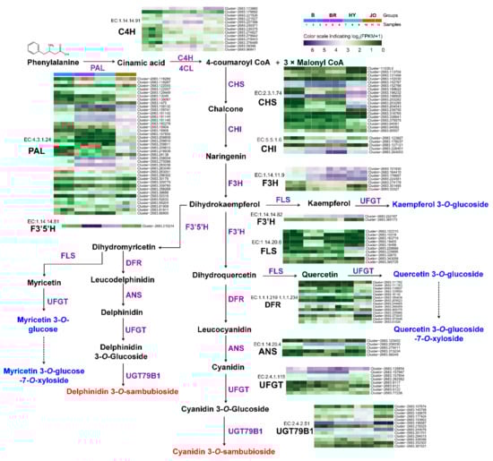 To further understand the coloration of okra pods, unigenes encoding proteins associated with anthocyanin biosynthesis were firstly identified (Figure 5). In comparison with the green cultivar Burmese, most of the anthocyanin biosynthetic genes were significantly up-regulated in pod skins of BR, HY and JO. Especially, EC:4.3.1.24 (phenylalanine ammonia lyase, PAL), EC:2.3.1.74 (chalcone synthase, CHS), and EC:1.14.11.9 (flavanone 3-hydroxylase, F3H) showed an enormous increase in gene expression levels. These up-regulated structural genes with high expression levels enhanced the metabolic flux towards anthocyanins and flavonols in the purple okra pods, compared with the green cultivar. Notably, EC:1.14.14.81 (flavonoid 3′,5′-hydroxylase, F3′5′H/CYP75A) was specifically expressed in both BR and HY cultivars with undetectable transcripts in the pod skins of both B and JO. The enhanced catalytic activity of F3′5′H resulted in the hydroxylation of B-ring at C5′ for the production of delphinidin-based anthocyanins and myricetin-based flavonol glycosides in the pods of both BR and HY cultivars, while these metabolites were absent in JO and B for the extreme low transcript abundance of F3′5′H. Similarly, it is easy to understand the lack of myricetin-based flavonol glycosides in the other 10 green okra cultivars.