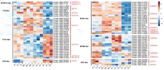 To study the regulatory mechanisms underlying the significant upregulation of the anthocyanin biosynthetic genes in purple okra, the transcript levels of transcription factor encoding genes were further analyzed. It has been proved that the expression of most of the anthocyanin structural genes are directly activated by a ternary protein complex consisting of R2R3-MYB TF (AtPAP1, AtPAP2, AtMYB113, and AtMYB114), bHLH TF (AtTT8), and WD40 repeat protein (AtTTG1) in Arabidopsis [13]. In this study, two genes encoding R2R3 MYB proteins which show high homology with AtMYB114 were screened. As show in Figure 6, the expression of AeMYB114-I and AeMYB114-II was evidently up-regulated in the pod skins of BR and HY while they showed no increased transcripts in JO, in comparison with anthocyaninless cultivars (Burmese). Similarly, three genes encoding TT8-like proteins showed an increase in transcript abundance in the pod skins of BR and HY, but display no changes in JO when compared to B (Figure 6 and Table S8). Usually, the R2R3 MYB proteins of the MBW complex are thought to be the principal determinants of the target genes and confer anthocyanin production in different patterns or cell types [1]. Therefore, the regulatory mechanism of anthocyanin biosynthesis in JO might be probably different from that in BR and HY. The WDR proteins of the MBW complex were proved to serve a stabilizing function and interact directly with the bHLH proteins [1,36]. The genes encoding TTG1-like proteins show similar expression profiles between the pods of BR and HY, and different expression patterns in JO, further indicating the different regulatory mechanisms of anthocyanin biosynthesis among the purple okra cultivars (Figure 6 and Table S8). Based on the results mentioned above, the up-regulation of MYB114-like, TT8-like, and TTG1-like proteins should account for the abundant anthocyanin accumulation in the pod skins of BR and HY, but not JO.