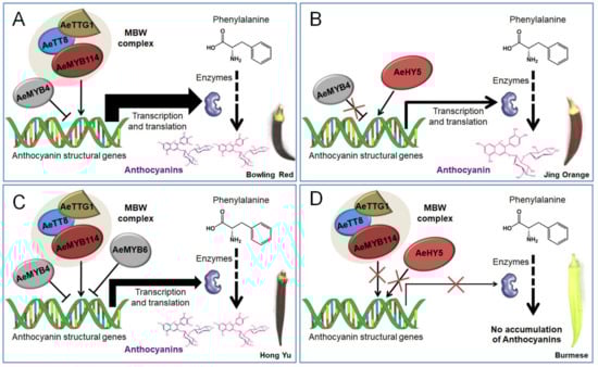 Proposed working models explaining the internal mechanisms for anthocyanin pigmentation in okra pods. Four putative working models underlying anthocyanin accumulation for Bowling Red (A), Jing Orange (B), Hong Yu (C), and Burmese (D) were provided respectively.