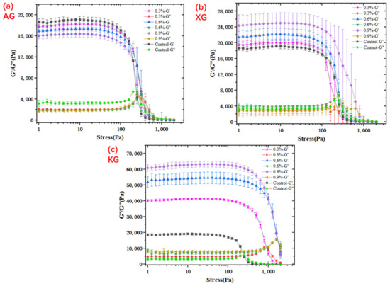 Oscillation stress profiles of ink samples: (a) AG; (b) XG; (c) KG.