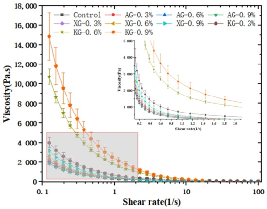 Figure 2 illustrates the viscosity profiles of inks with or without the addition of gums. All ink samples showed shear-thinning property, which is characterized by a viscosity reduction with the increase of applied shear rate, and no Newtonian plateau was observed. A small amount of XG and KG addition obviously increased the viscosity of ink samples within the shear rate range of 0.1–10 1/s. When the shear rate was over 10 1/s, the viscosity behavior of ink samples tended to converge, which was close to zero. Specifically, as for XG-containing ink sample at 0.3% and 0.6%, the viscosity respectively rapidly decreased from 2304 Pa to 66.52 Pa and from 2579 Pa to 61.92 Pa when the shear rate increased from 0.1 to 10 1/s. Addition of KG significantly increased the viscosity of ink samples compared with XG and AG, when the shear rate was less than 10 1/s. Specifically, as seen from Table 2, at 1/s, the viscosity of KG-0.9% sample was 2122.33 Pa, which was 5.27 times of XG-0.9% sample (402.87 Pa) and 7.77 times of AG-0.9% sample (273.30 Pa). AG addition decreased the viscosity of ink samples, for example, at 1/s, the viscosity of AG-0.3%, AG-0.6% and AG-0.9% samples were 313.75 Pa, 289.40 Pa and 273.30 Pa, respectively (Table 1). Again, this can be probably attributed to the AG addition preventing the hydrogen bond formation as discussed above [26,27].
