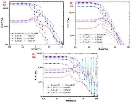 Viscoelasticity behavior like G′ is important for self-supporting performance of printed samples. G′ indicates solid-like behavior reflecting the mechanical strength and deformation resistance ability [17]. Additionally, regarding swallowing behavior, viscoelasticity of food also reflects the overall effect on swallowing pleasure [18,32]. To study the viscoelasticity behavior of ink samples with different formulation, amplitude oscillation strain sweep test was conducted at 1 Hz with strain ranging from 0.01% to 100%, as shown in Figure 3. All ink samples illustrated a similar pattern, that is within linear viscoelastic region (LVR). Both G′ and G″ were nearly independent of strain with G′ greater than G″, suggesting a solid-like gel behavior. Once exceeding the critical strain, G′ decreased sharply while G″ increased rapidly until reaching a crossover point. After critical strain, G″ became greater than G′, which indicates that the destruction of gel network structure and beginning of flow. KG addition significantly increased G′ of ink samples within LVR, and a higher amount of KG led to a higher G′. For example, the average value of G′ (within LVR) increased from 39554 Pa to 60890 Pa when KG increased from 0.3% to 0.9%. This was because KG probably formed a network structure through the aggregation of double helices, and a higher concentration enabled an easier formation [31]. As expected, an increase of G′ was also observed in the XG added samples. This was because xanthan gum can form intermolecular associations resulting in the creation of a network structure of bound molecules [29,30]. Interestingly, it should be noted that the addition of AG generally decreased the plateau values of G′ and G″ within LVR (Figure 3). This was consistent with the results of yield behavior (Figure 1) and viscosity profiles (Table 2). Again, this might be because the AG addition prevented the hydrogen bond formation [26,27].