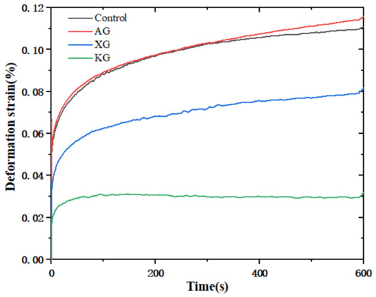 Creep deformation performance can reflect the self-supporting capability of 3D printed object [33]. In addition, during swallowing process the tongue provides a constant driving pressure to enable food bolus pass to the throat. Food bolus’s deformation under certain constant stress is also an important factor for safe swallowing [18,20]. The creep deformation behavior of control and ink samples containing three kinds of gums is shown in Figure 4. Incorporation of KG and XG improved the deformation resistance capability, indicated by decreased maximum strain for KG (0.03%) and XG (0.08%) samples, compared with control (0.11%). The deformation resistance ability illustrates a decrease order of KG > XG > control > AG, consistent with the results of G′ and yield performance as reported above (Figure 1 and Figure 3). This suggested that although KG and XG containing sample possessed good resistance to compressed deformation during 3D printing, they also required a high-pressure application to deform the food bolus during swallowing, which was not actually friendly for the swallow-impaired patients.