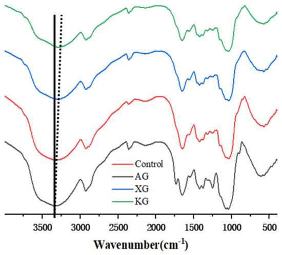 FTIR is an effective method to detect the presence of hydrogen bond and further compare their strength indirectly. A lower wave number indicates a stronger interaction among components. Samples with (0.6%) and without gums were analyzed using FTIR from 400 cm−1 to 4000 cm−1 (Figure 6). Significant absorptions at around 2930 cm−1, and 1730 cm−1 were observed, which are assigned to the asymmetric stretching vibration of methyl groups (C–H), and C=O stretching vibration (carbonyl or amide), respectively [35,36]. Absorption band at around 1050 cm−1 corresponds mainly to C-O and C-C stretching vibrations in polysaccharide [36,37,38]. Lentinan, the most important functional ingredient of shiitake, produces absorption band at 1650 cm−1 (C=O stretching) and 1400 cm−1 (carboxylate) [39]. As seen from Figure 6, the FTIR curves showed a comparable pattern, suggested that no new functional group was generated after gum added. There was a broadband absorption peak for all samples at around 3325 cm−1, which was ascribed to the vibrational stretching rising from molecular bound hydroxyl groups or absorption bands of poly-OH [23,36]. Particularly, the absorption broadband appeared at 3325 cm−1 for control sample, 3322 cm−1 for XG sample, 3316 cm−1 for KG sample, respectively. The decrease of wavenumber after addition of KG and XG indicated the enhancement of hydrogen bond formation. This might account for the greater G′ (Figure 1) and K (Table 2) of KG and XG added samples. In contrast, AG addition led to a slight shift toward longer wavenumber (3335 cm−1) compared with control and KG or XG added samples. This might be used to explain the decrease of mechanical strength (G′ and yielding behavior) of AG containing samples.