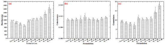 Texture properties of 3D printed samples. (a): hardness; (b): cohesiveness; (c): gumminess.