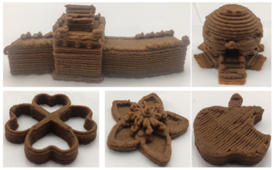 The ink samples were 3D printed into a hollow cylinder shape to assess their printability with different formulation. Generally, the samples printed with different formulations were quite close to the designed geometry after deposition. However, a slight deformation was observed over time for the cylinder printed with AG containing and control ink samples, indicated by a fatter bottom than upper part after storing for 60 min (Table 4). This was because that AG containing and control ink samples had relative low G′ and weak yield behavior (Figure 1 and Figure 3), so the printed samples were not strong enough to be self-supportable to resist gravity compressed deformation. Previous studies also reported that G′ and yield stress were important for the samples’ self-supporting capability [17]. The poor self-supporting performance of AG and control sample was also reflected by the relatively large creep % strain (Figure 6). The XG containing printed samples illustrated a smooth and appealing surface texture and no compressed deformation was observed. This was probably because the rendered creamy effect by XG through coating performance and enhancement of mechanical strength indicated by the improved G′ and yield stress (Figure 1 and Figure 3). Although the KG addition significantly increased the mechanical strength (G′, yield stress), KG containing printed samples showed a rough and dry surface structure with several defective points. Sometimes broken extrudate thread during printing was observed. This was probably because KG addition resulted in the formation of rigid and brittle structure [50] and significantly increased the mechanical strength of KG containing ink sample as indicated by the highest G′ and yield stress (Figure 1 and Figure 3). Figure 8 illustrates several printed samples using ink containing 0.6% XG. It was seen that samples with fine resolution and smooth surface displayed an attractive shape and visual appeal. This can certainly increase the appetite of people with swallowing disorders and increase the pleasure of eating.