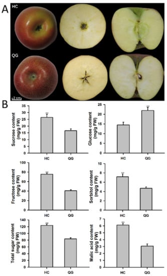 - Li, M.; Li, P.; Ma, F.; Dandekar, A.M.; Cheng, L. Sugar metabolism and accumulation in thefruit of transgenic apple trees withdecreased sorbitol synthesis. Hortic. Res. 2018, 5, 60. [Google Scholar] [CrossRef] [Green Version]