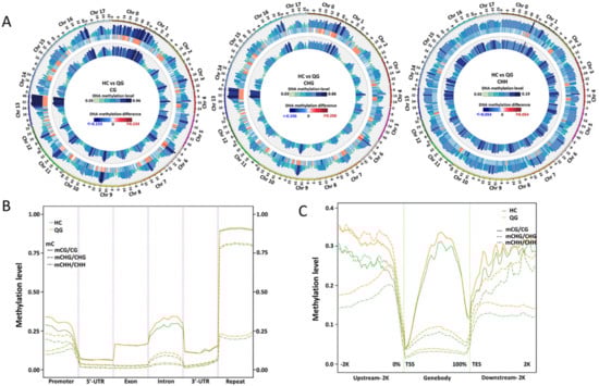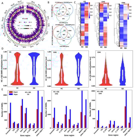 3.2. Genome-Wide Methylation Profiles in ‘HC’ and ‘QG’ Mature Fruits