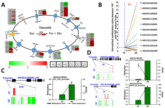 3.7. Vacuolar Transporter Genes: Differences in the Expression and Methylation Levels between ‘HC’ and ‘QG’ Mature Fruits