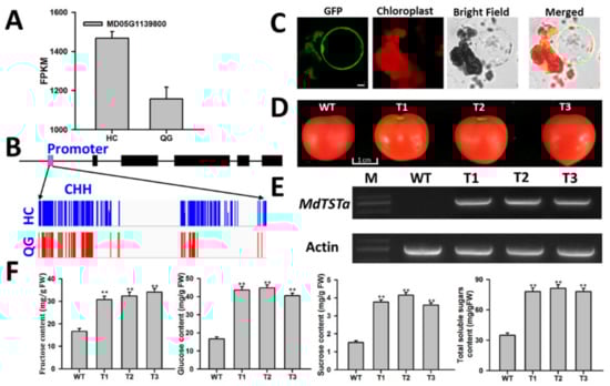 - Wang, Z.; Wei, X.; Yang, J.; Li, H.; Ma, B.; Zhang, K.; Zhang, Y.; Cheng, L.; Ma, F.; Li, M. Heterologous expression of the apple hexose transporter MdHT2.2 altered sugar concentration with increasing cell wall invertase activity in tomato fruit. Plant Biotechnol. J. 2019, 18, 540–552. [Google Scholar] [CrossRef] [Green Version]