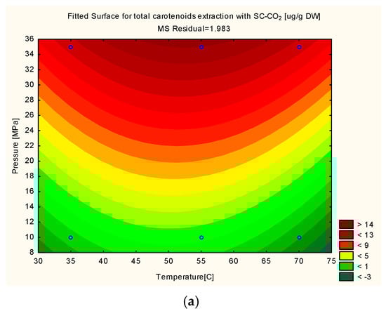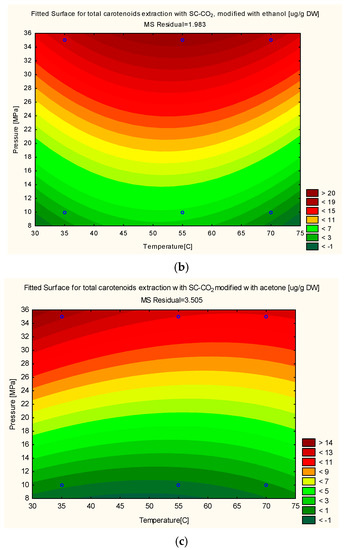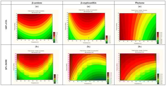 where is the dependent variable to be modelled (total carotenoids or individual carotenoids); and are the independent variables (temperature, pressure and co-solvent) and is the intercept; is the coefficient of linear effect; and are the coefficients of quadratic and interaction effects, respectively; and 3 is the number of variables. As explained, in this study, several models were developed for optimizing the extraction of total carotenoids as well as individual carotenoids. Additionally, surface plots from the fitted equations were generated in order to evaluate the effects of independent parameters and their mutual interaction.