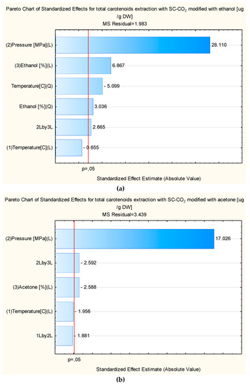 However, when the SC-CO2 was modified with acetone (Figure 2b), it was seen that only the linear effect of pressure (standardized effect of 17.0) positively influenced the recovery of carotenoids. Conversely, co-solvent concentration (standardized effect of −2.6), temperature (standardized effect −1.95) and the separate conjunctions of pressure and co-solvent and temperature and pressure (−2.59 and −1.88, respectively) exerted a significant but negative influence. Overall, these results show that pressure stands as an important factor for the extraction of compounds with SC-CO2 modified with acetone, where increasing temperature negatively influences on the overall yield.