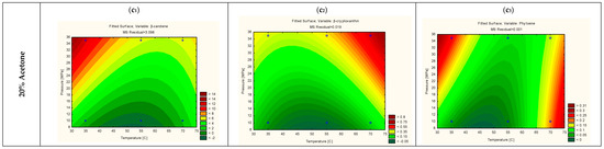 RSM for total carotenoids extracted with 0% co-solvent (a), 20% EtOH (b) and 20% acetone (c).