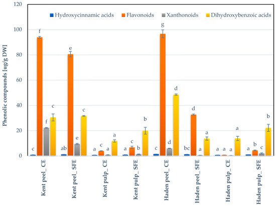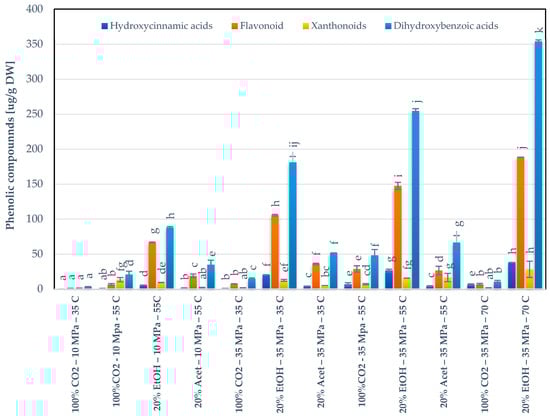 For a better understanding of the behavior of different phenolic classes, the individual compounds were separated in four groups: dihydroxybenzoic acids, flavonoids, hydroxycinnamic acids and xanthonoids (see Figure 4). Dihydroxybenzoic acids were quantified between 2.90 and 353.81 µg·g−1 DW. Flavonoids had a total yield ranging from 1.07 to 188.39 µg·g−1 DW. Within this group, quercetin was the most concentrated one, representing between 13 and 55 wt. % of the total class. With respect to hydroxycinnamic acids, ferulic acid represented between 28 and 86 wt. % of the total class. The overall yield of hydroxycinnamic acids was found to be between 0.15 µg·g−1 DW and 37.78 µg·g−1 DW. Finally, mangiferin was the only representative of the xanthones group, whose yield was between 1.1 and 28.15 µg·g−1 DW. The profile and the principal compounds found in this study were similar to those reported for mango by Schieber et al. (2000) and Agatonovic-Kustrin et al. (2018) [25,26] (chromatograms of the analysis of phenolics and carotenoids are displayed in Supplementary Material SS.4).