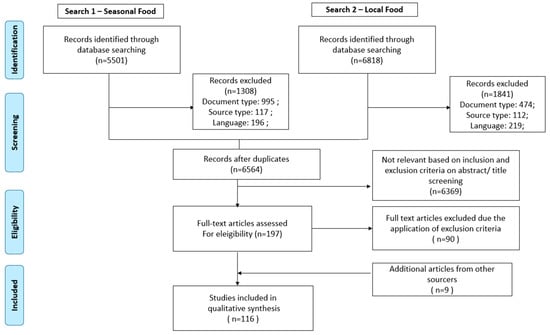 A total of 9170 articles were retrieved from database searching. After removing 3242 duplicate articles, titles and abstracts of articles were screened based on inclusion and exclusion criteria. Then, 197 articles were selected for full-text reading, and 90 were excluded using the exclusion criteria. Nine articles identified through screening references of review papers concerning local food were also included. Finally, 116 relevant studies were selected for the final analysis. The list of articles analyzed in the systematic review regarding local and seasonality concepts, ordered by publication year is available in the Appendix A.