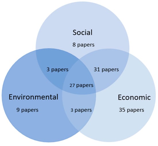 The sustainability dimension analysis was based on the three dimensions of sustainability: environmental, social, and economic, usually symbolized by three interlocking circles [2]. The popular three-circles diagram appears to have been first presented by Barbier, in 1987, although the three-pillar framework was a gradual construction. Elkington’s “triple bottom line” was very influential in cementing the three-pillar position in the mainstream [24]. Although a contemporary sustainability literature may focus on the SDGs, the three pillars themselves were clearly embedded in their creation [7].