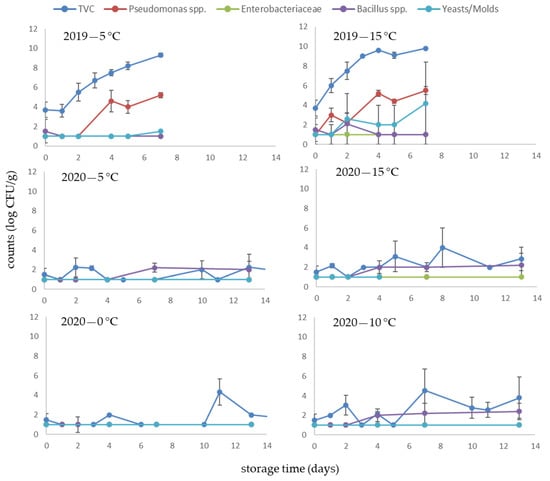 | Microbiological analysis | 7 time points | 2 time points | 6 time points | 8 time points (0, 5 °C), 9 time points (10, 15 °C) | 2 time points | 6 time points |