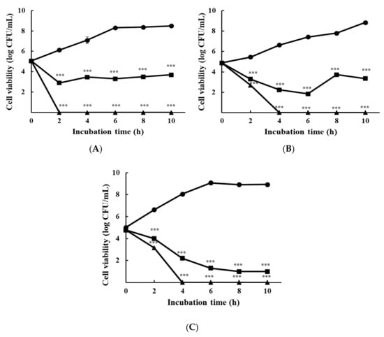 Time-kill assays were conducted by culturing bacterial cultures in TSB, with the same volume of ε-PL at concentrations of 1/2 × MIC, 1 × MIC, and 2 × MIC at 37 °C, and a non-treated medium was used as a control [21]. Bacterial cultures were prepared in four groups at a final concentration of 1 × 105 CFU/mL each, using the same protocol as described in Section 2.1. Aliquots were collected at 0, 1, 2, 4, 6, 8, and 10 h of incubation and then cultured in appropriate agar media at 37 °C for 24 h, followed by counting viable cell colonies. Single-species bacterial cultures were plated on TSA, and the multi-species bacterial culture was plated on xylose lysine deoxycholate agar (XLD; BD Difco) for Salmonella, Oxford agar (MB cell, Seoul, Korea) supplemented with Oxford supplement (MB cell) for Listeria, Eosin methylene blue agar (EMB; BD Difco) for E. coli, and TSA for total cell counts (Salmonella + Listeria + E. coli).